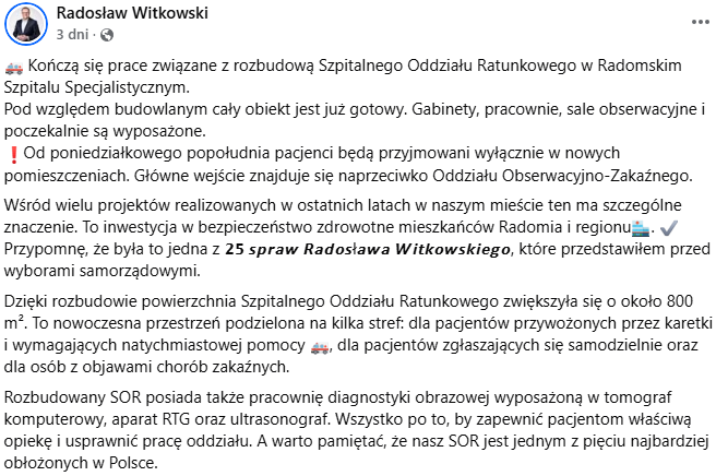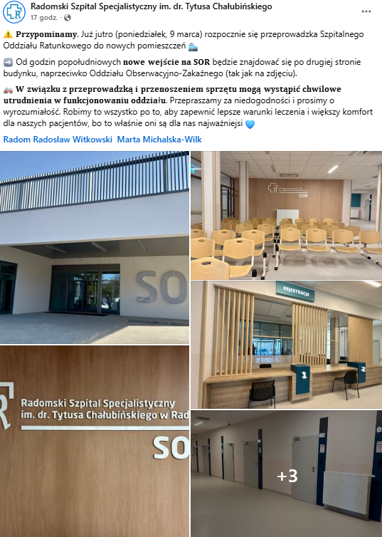 W poniedziałkowy poranek rozpoczęła się natomiast przeprowadzka do nowych pomieszczeń. Radomski Szpital Specjalistyczny poinformował za pośrednictwem mediów społecznościowych, że od godzin popołudniowych nowe wejście na SOR będzie znajdować się od południowej strony budynku.