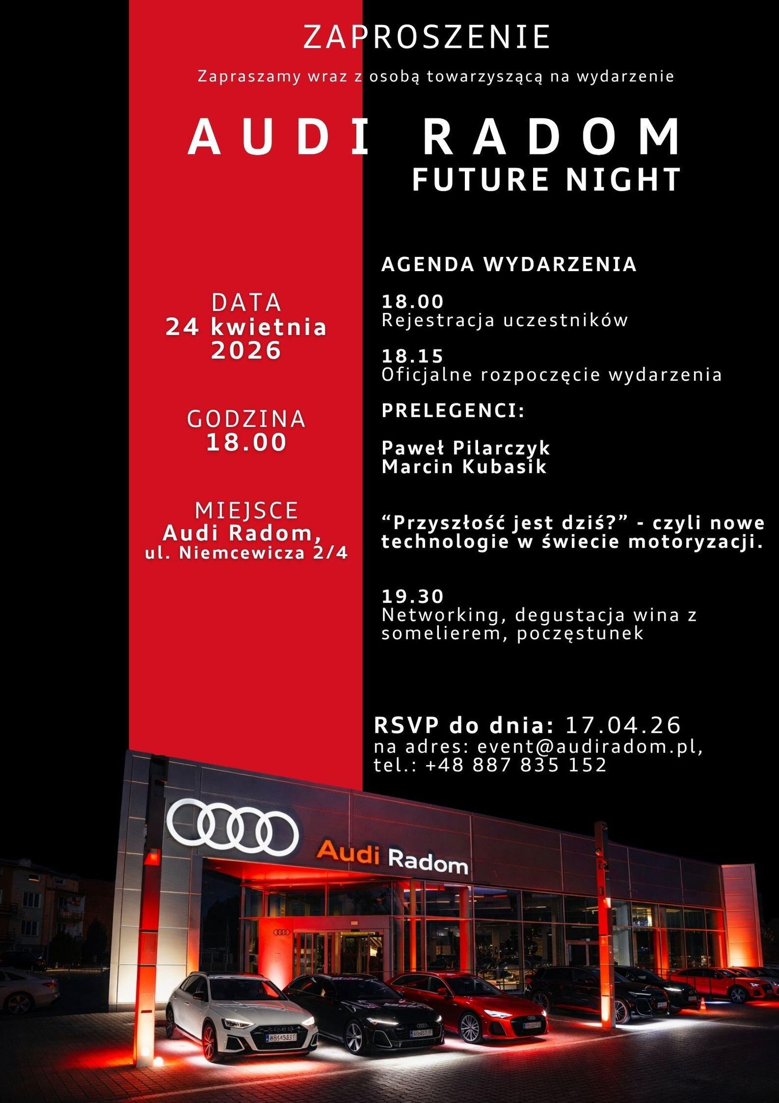 Wydarzenie miało kameralny, zamknięty charakter, co podkreślało jego wyjątkowość. Audi Future Night było także przestrzenią rozmów i networkingu dla osób związanych z biznesem, marką i nowoczesną motoryzacją.