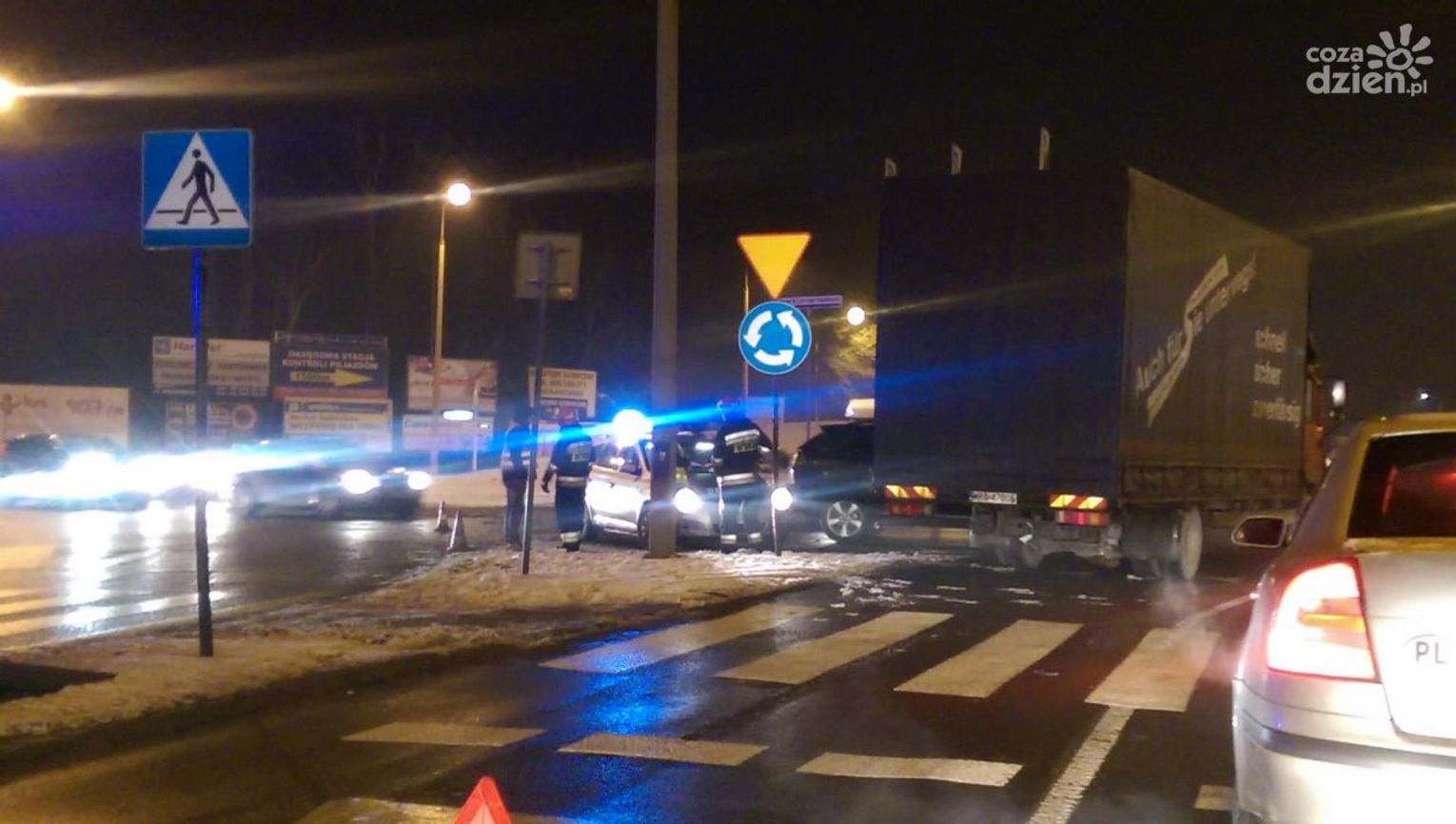 Na miejscu kolizji obecna jest straż pożarna, oraz policja która kieruje ruchem. W miarę możliwości naszym zmotoryzowanym czytelnikom radzimy omijać to miejsce.