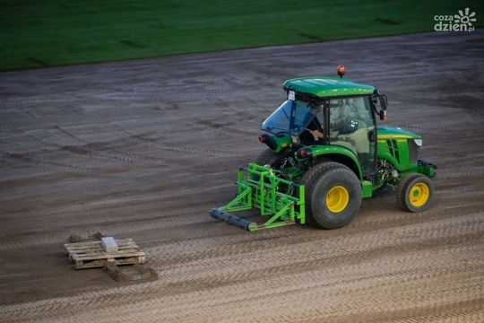Stadion Radomiaka nocą - układanie murawy (zdjęcia)